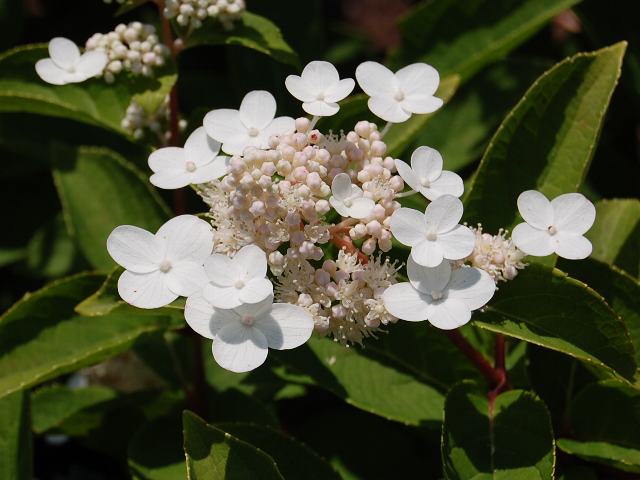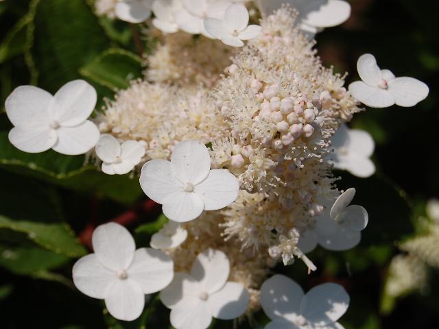 大きな円錐花序(下のほうになるほど枝分かれする回数が多く、全体をみると円錐形になる)を出して白い両性花をたくさんつけ、周囲に数個の装飾花をつける。