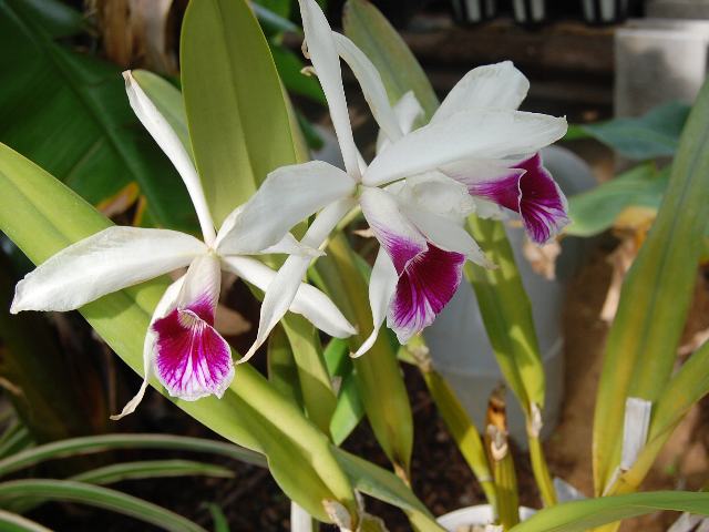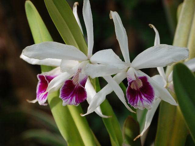 花の色は白く、唇弁が紅紫色をしている。