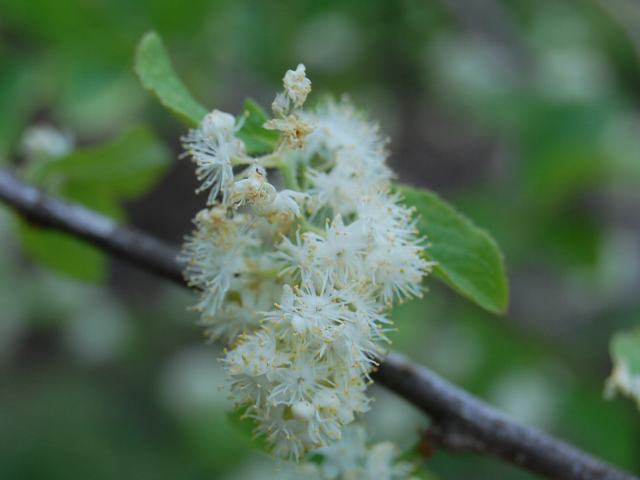 葉の脇に散房花序(柄のある花がたくさんつき、下部の花ほど柄が長いので花序の上部がほぼ平らになる)を出し、花径15ミリくらいの小さな白い花をつける。