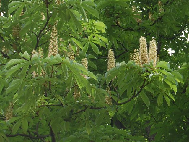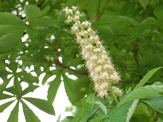 花穂は上を向いていて大きいので、花の季節には遠くからでもトチノキだとわかる。